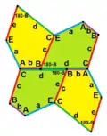 ![]() 2a + c = d = e A = 90°, 2B + C = 360° C + E = 180° | ![]() 2a = d = c + e A = 90°, 2B + C = 360° C + E = 180° | ![]() d = 2a = 2e B = E = 90°, 2A + D = 360° |