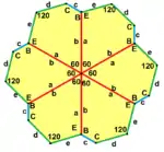 ![]() a = b = c, d = e A = 60°, B = 120°, C = 90° D = 120°, E = 150° | |||