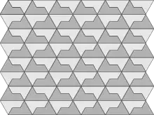 ![]() Замощение плоскости одной пятиугольной плиткой (типа 3) через формирование регулярной мозаики из шестиугольников двух разных размеров (каждый из которых разбивается либо на 3, либо на 9 плиток) |