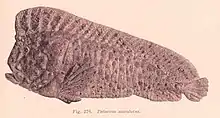 Тело удлинённое, сжатое с боков, в передней части высота тела составляет 32—49 % от стандартной длины тела; сужается к маленькому хвостовому стеблю. Голова большая, её длина составляет 38—50 % от длины тела, передний профиль рыла почти вертикальный. Глаза среднего размера, их диаметр равен 9—13 % длины головы, расположены на верху головы. Рот косой, длина верхней челюсти составляет 36—41 % длины головы. Зубы мелкие, расположены одной полосой на каждой челюсти. На верхней части жаберной крышки есть два низких косых гребня, на голове шипов нет. Чешуя отсутствует. Тело и плавники у взрослых особей покрыты небольшими мясистыми бугорками и бородавчатыми структурами. Боковая линия слабо выражена, тянется от верхнего края жаберной щели до хвостового стебля, состоит из 8—20 нечётких мельчайших пор[2].