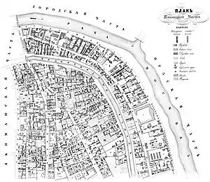 ![]() Пятницкая часть (северная половина) в атласе Хотева (1852) |