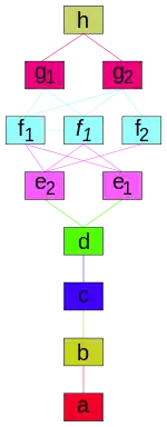 - Некоторые ячейки разделяются на два типа, им даются индексы. Например, в группу e входят ячейки e1 и e2. Множество f1 подразделяется далее на правую и левую формы, которые обозначаются f1 (обычная буква) и f1 (наклонная). Там, где все уровни представлены, они заменяются большой буквой, заменяя всю последовательность, например, a + b + c + e1 записывается как Ce1.