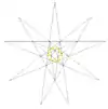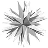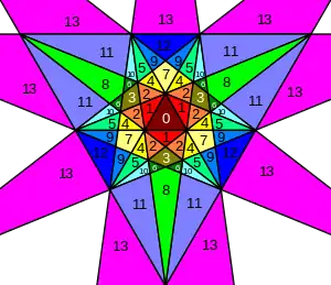 - Все звёздчатые формы можно определить диаграммой звезды. На приведённой диаграмме окрашенные пронумерованные области показывают части, которые должны появляться вместе как единое целое, если добиваться полной икосаэдральной симметрии. Диаграмма содержит 13 таких наборов. Некоторые из них подразделяются на хиральные пары (не показано), что даёт звёздчатые формы с вращательной симметрией, но не зеркальной. В таблице грани, которые видны снизу, указаны апострофом, например, 3'.