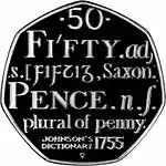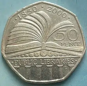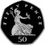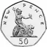 Монета Великобритании пятьдесят пенсов (50p) — часто называется «fifty pee» — появилась 14 октября 1969 после реформы с целью замены Банком Англии монет в шиллингах. Несмотря на новую форму монеты, было первоначальное замешательство среди некоторых представителей общественности, эту монету ошибочно принимали за старую монету половина кроны и новую десять пенсов.[1]