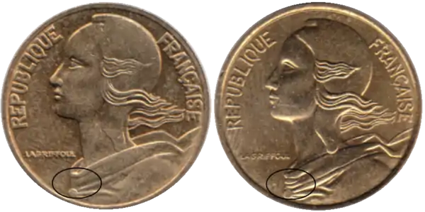 Монеты 1962 и 1963 годов имеют две разновидности, отличающиеся количеством складок на одежде Марианны (3 или 4)[2].