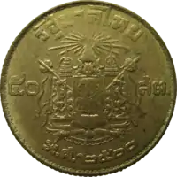 | 22,9 мм | 4,5 г | алюминиевая бронза | Портрет Рамы IX, его имя и титул | Герб Королевской полиции Таиланда, указание страны, номинала и года чеканки | 1950 | ||