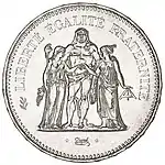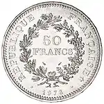 Монета 20 франков этого типа была не принята в 1973 году, но монета 50 франков, выпускалась в течение 6 лет.