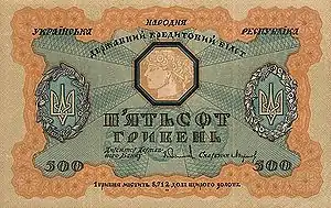 184×119 мм | светло-оранжевый и голубой | номинал, герб УНР, голова в венке | номинал, герб УНР, предупреждение о подделке денег | 1918 | 17 октября 1918 | после 1921 | |