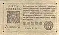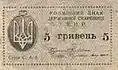 Накануне эвакуации из Киева в феврале 1919 года, министр финансов Борис Мартос приказал вывезти из города все запасы денег, хранившихся в Государственном банке, литографские камни и другие материалы, которые использовались для печати денег. После кратковременного пребывания в Виннице, где из-за нехватки соответствующей технической базы не удалось наладить изготовление денег, Министерство финансов УНР переехало в Каменец-Подольский, а Экспедиция Заготовки Государственных Бумаг была отправлена в Тернополь, а затем — в Станиславов (ныне Ивано-Франковск). Этот шаг был обусловлен мерами безопасности и наличием в этих городах надлежащей печатной базы. В Станиславе новый руководитель Экспедиции Николай Данильченко наладил изготовление разменных знаков Государственной казны УНР номинальной стоимостью 5 гривен. При изготовлении проекта были использованы элементы рисунков Григория Золотова, Антона Середы и Георгия Нарбута. Они печатались чёрной краской на качественной бумаге серого цвета с водяными знаками. Основное количество купюр этой эмиссии использовалось населением Галиции.[1]