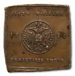 Самая крупная по весу пятикопеечная монета — 5 копеек Екатерины I, чеканки 1726 года весом 81,9 грамма, изготовленная на Екатеринбургском платовом дворе в виде медной квадратной платы размером 45×45 мм.[3]