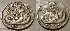 5 копеек 1790 года, (медь, вес 50-51 г., диаметр 40-42 мм). Монета чеканилась с 1762 по 1796 год.