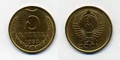 Монеты достоинством в 5 копеек стали чеканить в 1924 году из меди; затем с 1926 года по 1957 год выпускались монеты из алюминиевой бронзы; с 1961 по 1991 год выпускались монеты из латуни. Со временем существенно менялся только рисунок герба СССР, где изменялось количество перевязей на снопах пшеницы, их максимальное количество доходило до 16-ти, по количеству союзных республик.