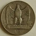 В 1936 году появился новый тип 5 лир с изображением богини плодовитости Фекундитас с четырьмя детьми. Внизу фигуры помещены номинал, два года выпуска — один по стандартному григорианскому календарю, другой — прихода к власти в Италии фашистской партии. Монету для оборота выпускали всего лишь 2 года в 1936 и 1937. Ещё в течение 1938—1941 годах исключительно для нумизматов чеканили 20 экземпляров ежегодно[11].