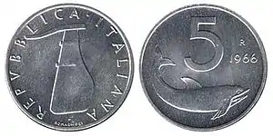 В Итальянской республике 5 лир стали разменной монетой, которую чеканили многомиллионными тиражами. Их выпускали с 1946 по 2001 год. По мере девальвации лиры их покупательная способность падала. Последние несколько лет с 1999 по 2001 год их чеканили исключительно для нумизматов либо качества пруф, либо в наборах. С 2002 года страна перешла на евро. Обмен производился по курсу 1 евро за 1936,27 лиры[12]. Соответственно 5 лир на момент прекращения хождения соответствовали 0,25 евроцента.