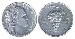 За неполные 50 лет было выпущено 2 типа монет номиналом в 5 лир. В зависимости от нанесённых изображений они имеют названия «Виноград» и «Дельфин». Смена дизайна была обусловлена изменением в их весе и диаметре[13].