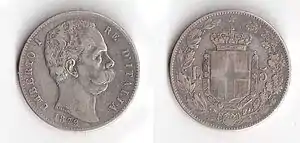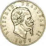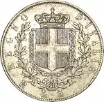 В 1863 и 1865 годах на монетном дворе Турина выпустили золотые 5 лир. Её выпуск был обусловлен соглашениями в рамках подготовки создания Латинского монетного союза, направленного на унификацию денежного обращения целого ряда европейских государств. Из-за своего малого размера (вес 1,61 г, диаметр 17 мм) она была крайне неудобной для оборота. При этом она циркулировала одновременно с серебряными аналогами. 5 ноября 1878 года золотые 5 лир демонетизировали[3]. Серебряные 5 лир 1861—1878 годов чеканили миллионными тиражами на монетных дворах Турина, Неаполя, Милана и с 1870 года Рима. О происхождении той или иной монеты говорит знак монетного двора — небольшая буква на реверсе монеты. Для Турина это «T», Неаполя — «N», Милана — «M», Рима — «R». Изображения на ней были стандартными для монет королевской Италии — портрет короля на аверсе, герб Савойского дома и легенда с обозначением номинала и страны на реверсе[4].