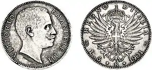 При Викторе Эммануиле III (1900—1946) было выпущено пять монетных типов 5 лир. Первый тип, получивший название «Aquila Sabauda» («Савойский орёл»), был отчеканен в количестве всего лишь 114 экземпляров. Это были первые монеты с изображением нового короля, и они предназначались исключительно для подарков королю, королеве, министрам и другим высокопоставленным лицам государства[7][8]. В 1911 году тиражом 60 тысяч отчеканили памятные 5 лир в честь 50-летия основания королевства Италия. Она получила название «Cinquantenario» (рус. 50-летие). На реверсе монеты изображены мужчина и женщина, символизирующие Италию и Рим, на фоне военного парового корабля[9]. Одновременно с тем же изображением в оборот поступили золотые 50 лир, а также медные 10 чентезимо и серебряные 2 лиры. В 1914 году выпустили ограниченным тиражом одну из красивейших монет Италии с изображением несущейся, запряжённой 4 лошадьми колесницы, которой управляет женщина, представляющая аллегорическое изображение Италии[9][8].
