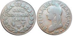 23 | 5 | Медь | 1795—1796 (4—5 годы) | Монетные дворы — Париж (A), Лимож (I), Нант (T), Лилль (W) | ||