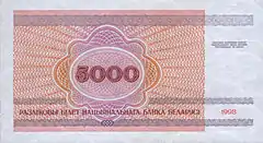 На оборотной стороне в узорном орнаменте помещено цифровое обозначение номинала — «5000». В верхней части банкноты через всё поле проходит узорная кайма, в нижней части проходят две узорные каймы, между которыми размещается надпись «РАЗЛІКОВЫ БІЛЕТ НАЦЫЯНАЛЬНАГА БАНКА БЕЛАРУСІ». В правой нижней части обозначен год — «1998». В верхней правой части надпись мелкими буквами «ПАДРОБКА РАЗЛІКОВЫХ БІЛЕТАЎ НАЦЫЯНАЛЬНАГА БАНКА БЕЛАРУСІ ПРАСЛЕДУЕЦЦА ПА ЗАКОНУ»[6].