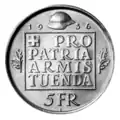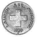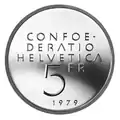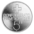 В 1936 году была начата чеканка памятных монет, соответствующих по характеристикам (размер, вес, проба металла) стандартным швейцарским монетам и являющихся законным платёжным средством. По 1963 год монеты чеканились из серебра. В 1971 году серебряные монеты в пять франков 835-й пробы, чеканившиеся в 1931—1969 годах (в том числе и памятные монеты 1939—1963 годов), были изъяты из обращения.