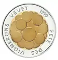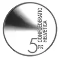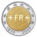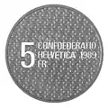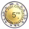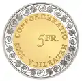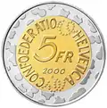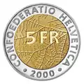2000 | 150 лет швейцарскому франку | 33 | 15 | Медь—алюминий—цинк—олово 890/50/50/10 (центр) Медь—никель 750/250 (кольцо) |