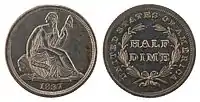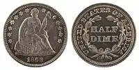 5 центов с изображением сидящей Свободы чеканились продолжительное время с 1837 по 1891 год. Подготовленный гравёром Томасом Салли и модифицированный Кристианом Гобрехтом дизайн аверса был помещён на монетах номиналом в 5, 10, 25, 50 центов, а также на серебряный доллар.