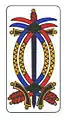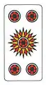 В колоде Таро пятёркам пик, треф, бубён и червей аналогичны пятёрки мечей, жезлов, денариев и кубков соответственно. Ниже приводятся изображения этих карт из колоды таро Висконти-Сфорца (1450 г.), в которой масть жезлов заменена стрелами.