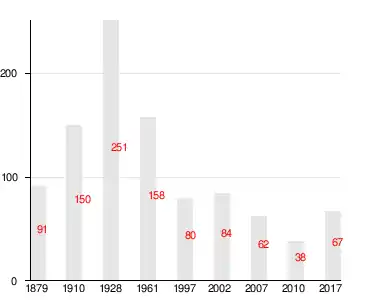 Число жителей по семейным спискам 1879 г.: 45 м. п., 46 ж. п.; по приходским сведениям 1879 г.: 44 м. п., 51 ж. п.[3]
