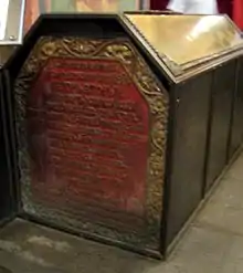Благочестивейший и самодержавнейший государь Пётр Вторый император Всероссийский. Рождён в лето 1715 октября 12, прародительское владение приемши 1727 году 7 мая венчанный и помазанный 1728 году февраля 25 дня. Великих благ чаянием подданных своих вкратце обнадежив, изволением Божиим к вечному царствию преселися в лето 1730 иануария 18. Разсыпася радость сердец наших, обратися в плач лик наш, спаде венец с главы нашея, горе нам, яко согрешихом (Плач. 5:15-16).