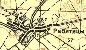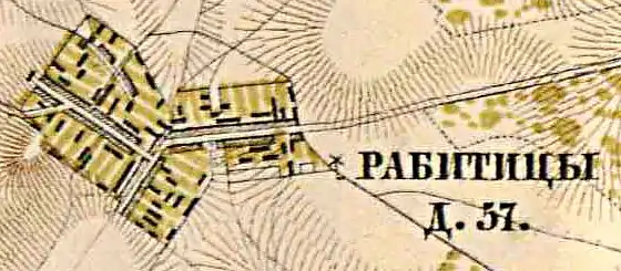 РАБИТИЦЫ — деревня ротмистра Перовского, 10 вёрст по почтовой, а остальные по просёлочной дороге, число дворов — 28, число душ — 67 м. п. (1856 год)[12]