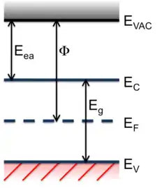 Более универсальной величиной, вместо для полупроводников является энергия сродства к электрону, равная Например, для кремния сродство составляет 4,05 эВ, а работа выхода примерно от 4,0 до 5,2 эВ (для собственного материала около 4,6 эВ).