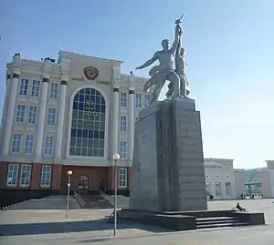«Рабо́чий и колхо́зница» — памятник монументального искусства, «идеал и символ советской эпохи», признанный «эталон социалистического реализма». Представляет собой скульптурную группу из двух фигур, мужской и женской, которые устремлены вперёд и поднимают над своими головами серп и молот[1]. Концепция и композиционный замысел принадлежат архитектору Борису Иофану, автор пластического воплощения — Вера Мухина[2]. Монумент предназначался для павильона СССР на международной выставке в Париже в 1937 году, его спроектировали и собрали в Москве, затем разделили на 65 частей и перевезли во Францию, где провели монтаж вторично. Скульптура была выполнена из нержавеющей хромоникелевой стали, облицовка из листов 0,5 мм толщиной крепилась на внутренний каркас, совокупная масса монумента превышала 63 тонны[3][4][5].