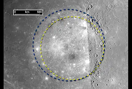 ![]() Жёлтое кольцо — первое определение границ, синее — уточнённое по данным АМС «Мессенджер» | |