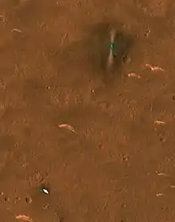 Китайская миссия Тяньвэнь-1 приземлилась в южной части Равнины Утопия 14 мая 2021 года. HiRISE сделал это изображение 6 июня 2021 года. Видны посадочный модуль, сам марсоход немного южнее после того как он спустился с посадочного модуля. Окружающая местность очень типична для южной части Равнины Утопия, с гладкой и большей частью без валунов. Яркие изгибы представляют собой эоловые формы рельефа. Также видны парашют, задняя часть спускаемого аппарата и тепловой экран.