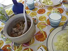 Представляет собой комбинацию разных видов нарезанного довольно крупными кусками мяса (баранина, свинина, говядина), которое тушится при достаточно низкой температуре (120°) в печи или духовке в течение нескольких часов. В блюдо обязательно добавляют лук, перец, соль, однако существует широкий спектр необязательных компонентов, среди которых лавровый лист, морковь и другие корнеплоды (сельдерей, брюква)[3].