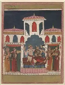 В средневековой Индии большую роль сыграла книга «Бхагавата-пурана», которая послужила основой для становления мощного культа бога Вишну — вишнуизма. В книге содержатся легенды, прославляющие Вишну в виде его инкарнации — бога Кришны. Первая часть Десятой книги «Бхагавата пурана» посвящена его детским проделкам и любовным историям. Другое сочинение, «Расапанча дхьяя», придаёт мифу о Кришне совершенно иное звучание, описывая танцы и любовные игры Кришны — «владыки осенних лун». Череду этих божественных любовных игр, флирт и связанные с этим затеи Кришны обозначают словом «лила». Сюжеты из «Кришна-лилы» были излюбленными темами для раджпутских художников начиная с XVI века.