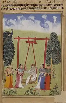 - Рага Хиндол. «Хиндол» означает «качели». Мелодия раги ассоциируется с Праздником качелей, который бывает в месяц шравана, и с праздником Джулан-Ятра Кришны (Праздник качелей Кришны в священном городе Натхадваре). Обычно её исполняют в утренние часы (с 8.00 до 12.00 дня). Согласно древним текстам Раге Хиндол принадлежат пять «жён» — Лалита, Рам-Кали, Патманджари, Десакх и Вилавал.