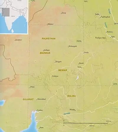 Раджпутская живопись ведёт своё происхождение от джайнской традиции книжной миниатюры, но наибольший расцвет пережила под влиянием могольской живописи. Отношения раджпутов с моголами были сложными и подчас противоречивыми. Когда в XVI веке в северную Индию вторглись войска могольского императора Бабура, глава самого сильного раджпутского княжества Мевар — Рана Санграм Сингх попытался организовать сопротивление, но в битве при Кхануа возле Агры в 1527 году потерпел поражение и вскоре скончался от ран. Покорение Мевара было необходимо моголам в связи с тем, что это княжество находилось на пути из Дели в богатую приморскую провинцию Гуджарат, через которую шёл поток пилигримов в Мекку. Могольские императоры не оставляли мысли взять эту выгодную территорию под свой контроль, поэтому внук императора Бабура — Акбар в 1567-68 годах провёл в Раджастане опустошительную военную кампанию и захватил меварскую столицу — крепость Читтор. Князь Мевара Удай Сингх бежал из города и впоследствии основал новую столицу — Удайпур. Эти события сильно деморализовали правителей других, более мелких раджпутских княжеств. Джайпур, Биканер, Джодхпур и Джайсалмер стали вассалами моголов.