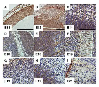 Радиальная глия — глиальные клетки с длинными отростками, играющие важную роль в нейрональной миграции, построении слоёв коры мозга и мозжечка, а также являющиеся предками в процессе нейрогенеза[2][3].