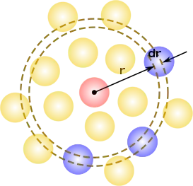 Проще говоря, это вероятность обнаружения частицы на расстоянии от выбранной частицы по сравнению с аналогичной вероятностью для идеального газа. Общий алгоритм включает определение того, сколько частиц (синие частицы, центры которых попадают в выбранную область) находится на расстоянии и (пунктирные линии) от выбранной частицы(оранжевая частица на картинке).