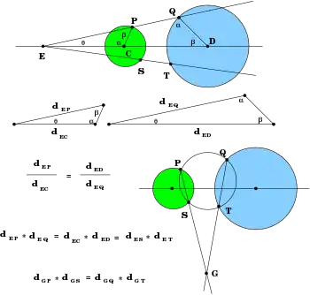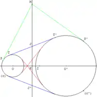 - Антигомологические хорды[уточнить] двух окружностей пересекаются на их радикальной оси (видимо, имеются в виду две хорды, проходящие через две пары антигомотетических точек двух окружностей, см. рис. ниже).