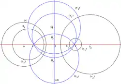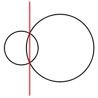 - Если окружности пересекаются в двух точках, то их радикальной осью будет прямая, проходящая через эти точки, если они касаются внешним образом — то радикальной осью будет общая внутренняя касательная, если внутренним — то общая касательная (единственная).