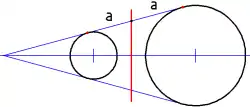 - Если P — точка на радикальной оси, то длины касательных из точки P к обеим окружностям равны — это следует из того, что степень точки равна квадрату длины отрезка касательной. В частности, радикальная ось делит пополам отрезки общих касательных.