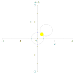Расширяющиеся окружности точек степени d относительно каждой из двух начальных окружностей и точки, принадлежащие радикальной оси (жёлтые).