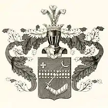 Щит имеет посередине полосу, составленную из серебряных и зелёного цвета шахмат; в нижнем красном поле согнутая рука в серебряных латах и со шпагой, пронзающей серебряную луну, означенную в верхнем голубом поле рогами вверх, а с правой стороны, над полосой, изображён золотой крест.