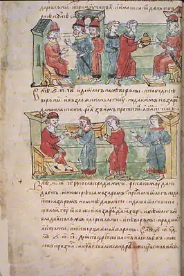 ![]() Миниатюра из Радзивилловской летописи, конец XV века, первое упоминание радимичей под 885 годом | |