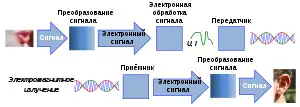 На передающей стороне (в радиопередатчике) формируется высокочастотный сигнал определённой частоты (несущий сигнал, «несущая частота»). На него накладывается информационный сигнал, который нужно передать (звук, изображение и т. д.) — происходит модуляция несущей частоты информационным сигналом. Модулированный сигнал излучается передающей антенной в пространство, в виде радиоволн.