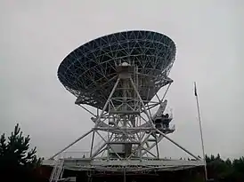 Радиотелескоп РТФ-32 с повёрнутым главным зеркалом (видна надзеркальная камера и вторичная система с контррефлектором)