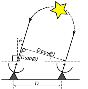 Фронт электромагнитной волны, излучённой далёкой звездой, вблизи Земли можно считать плоским. В случае самого простого интерферометра, состоящего из двух антенн, разность хода лучей, пришедших на эти две антенны, будет равна