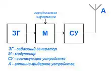 - модулирующее устройство, изменяющее параметры излучаемой волны (амплитуду, частоту, фазу или несколько параметров одновременно) в соответствии с сигналом, который требуется передать (часто задающий генератор и модулятор выполняют в одном блоке — возбудитель);